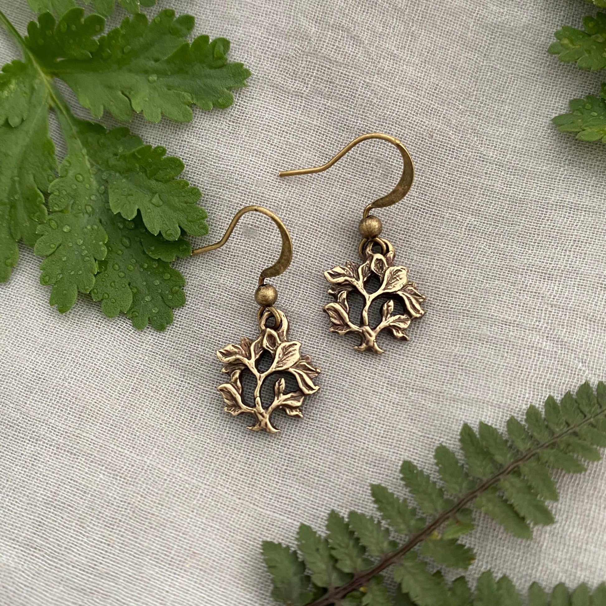 I first carved the little tree in jewelers wax, then had it reproduced in brass by a casting house in the USA. I oxidize and sensitively hand finish each piece. They hang on antiqued brass ear hooks.