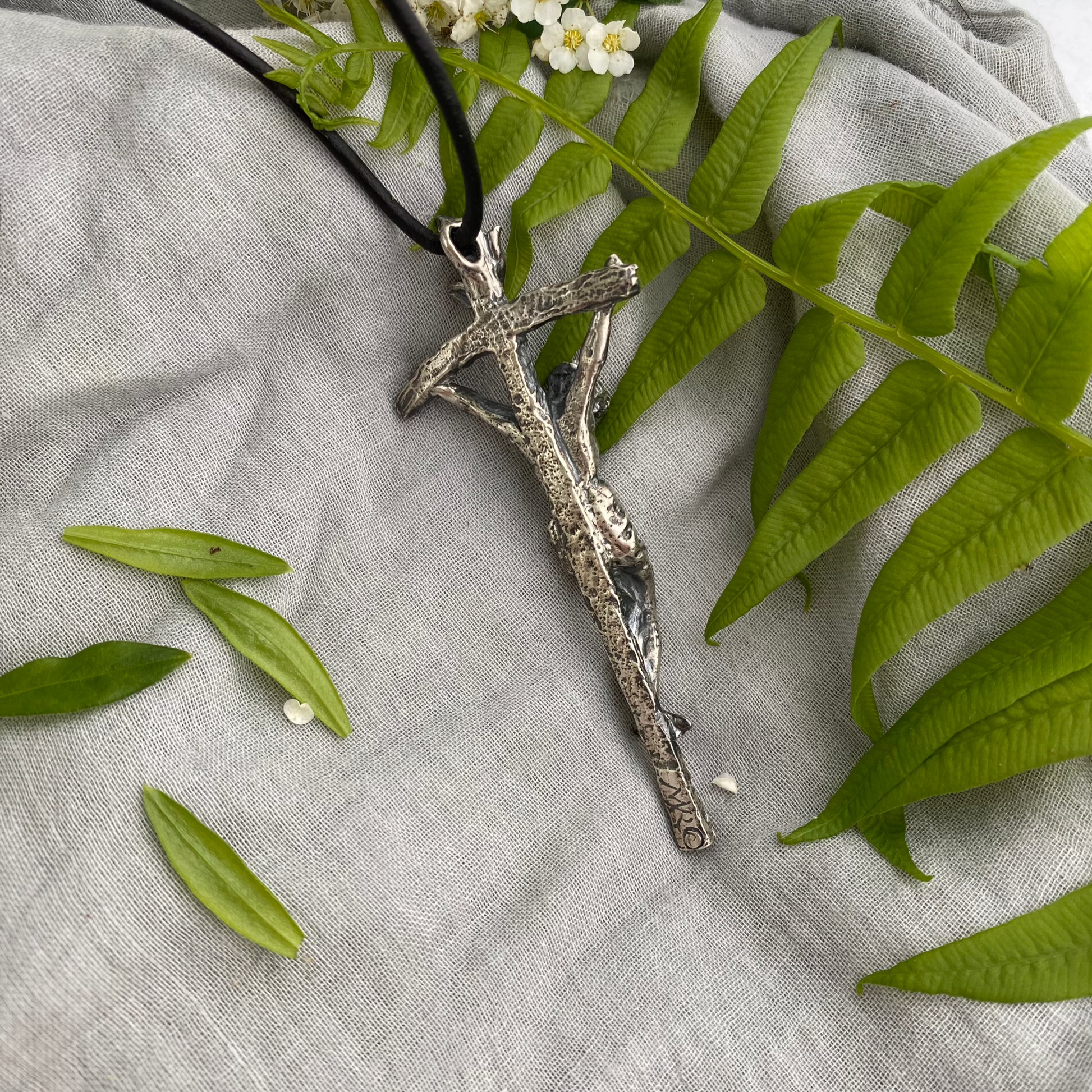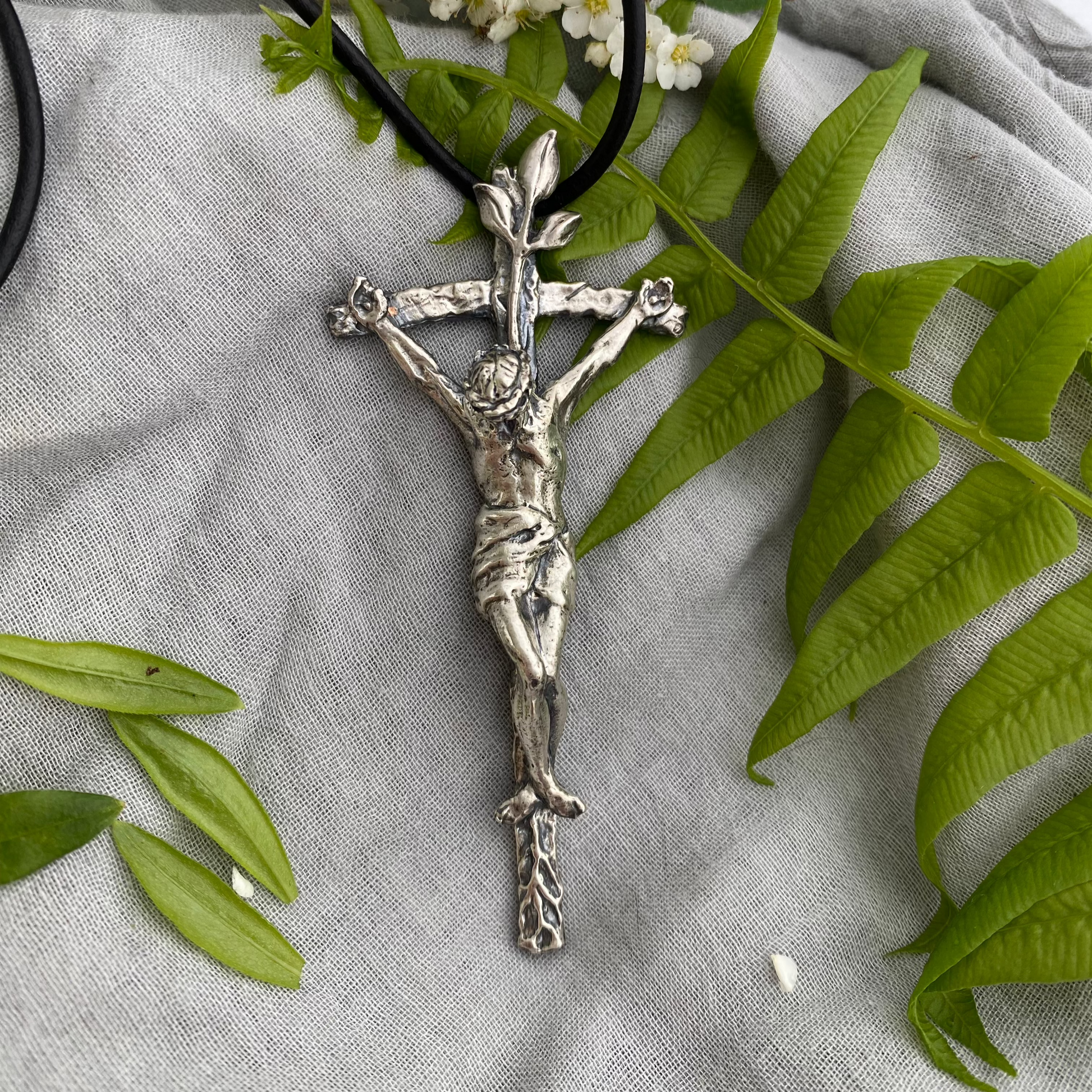 large sterling silver crucifix on black leather cord with realistic corpus and leeaves