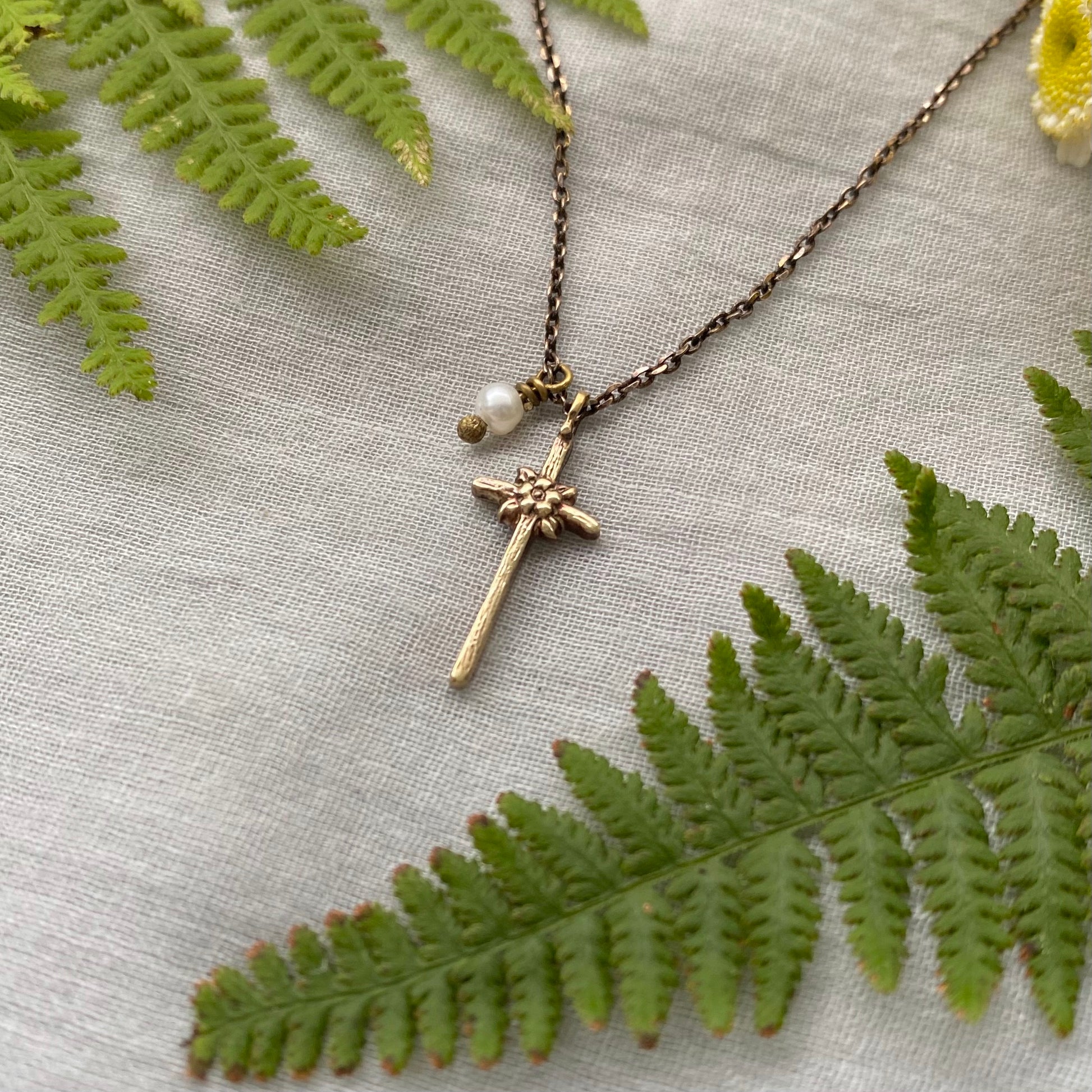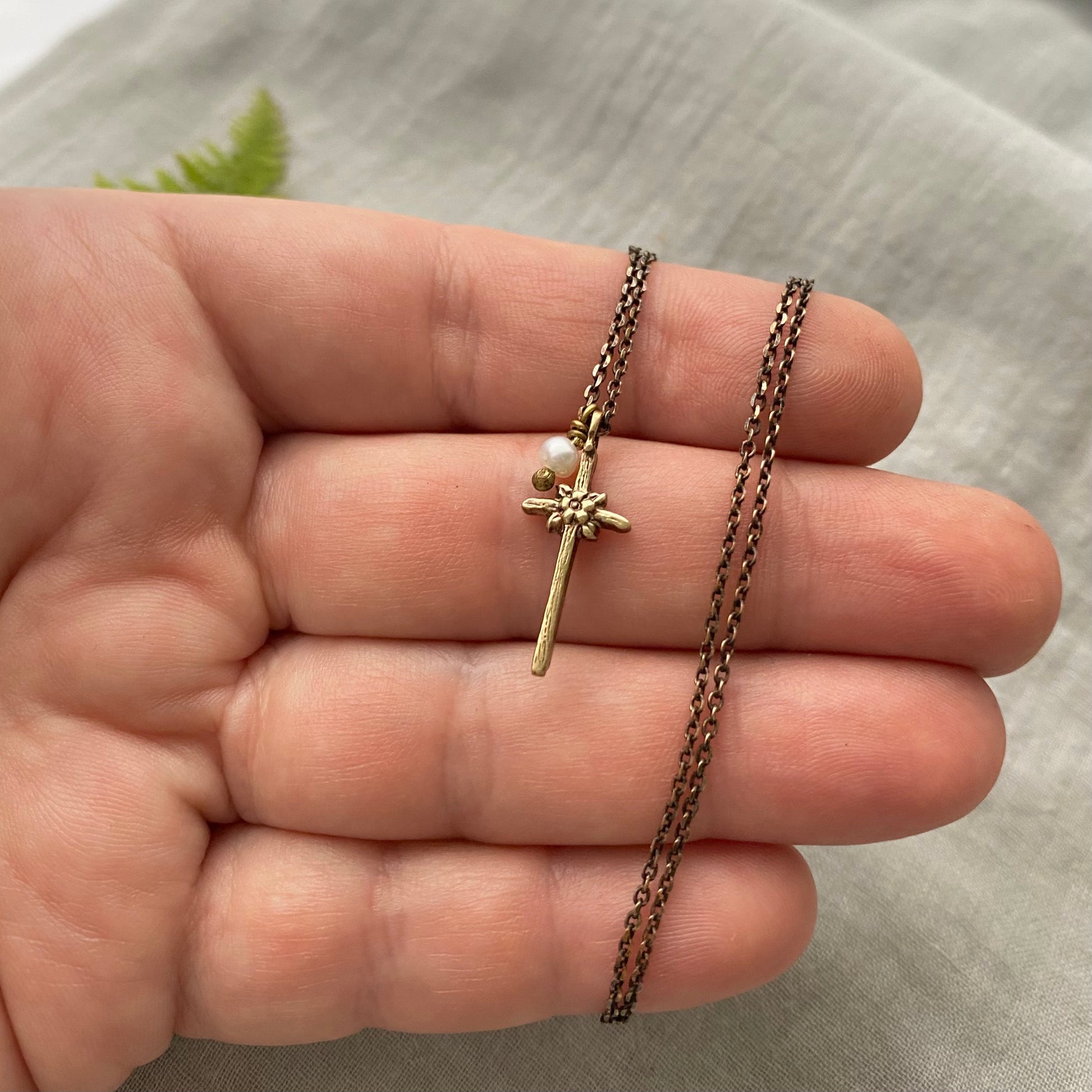 Tiny dainty cross necklace with freshwater pearl; antiqued brass pendant and chain
