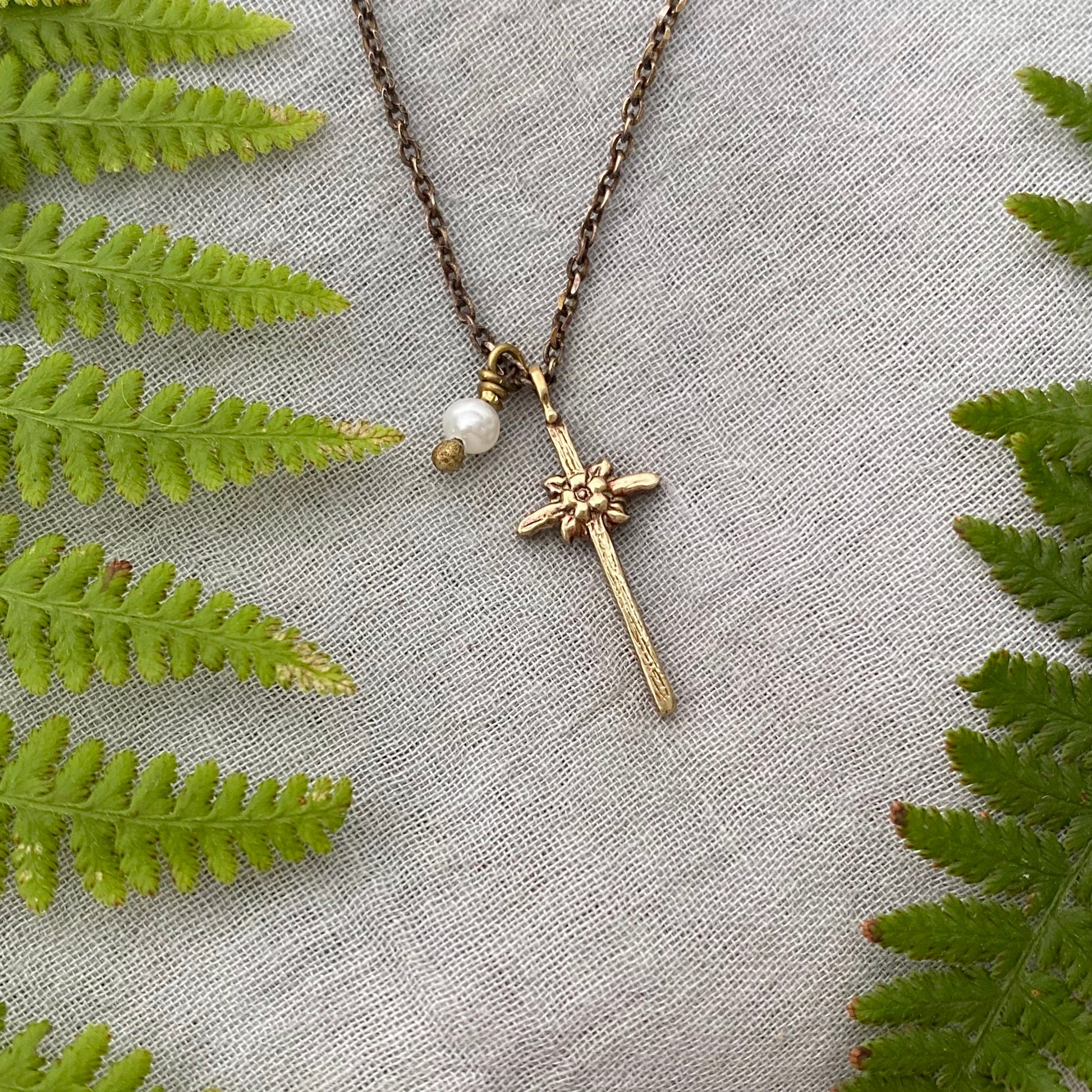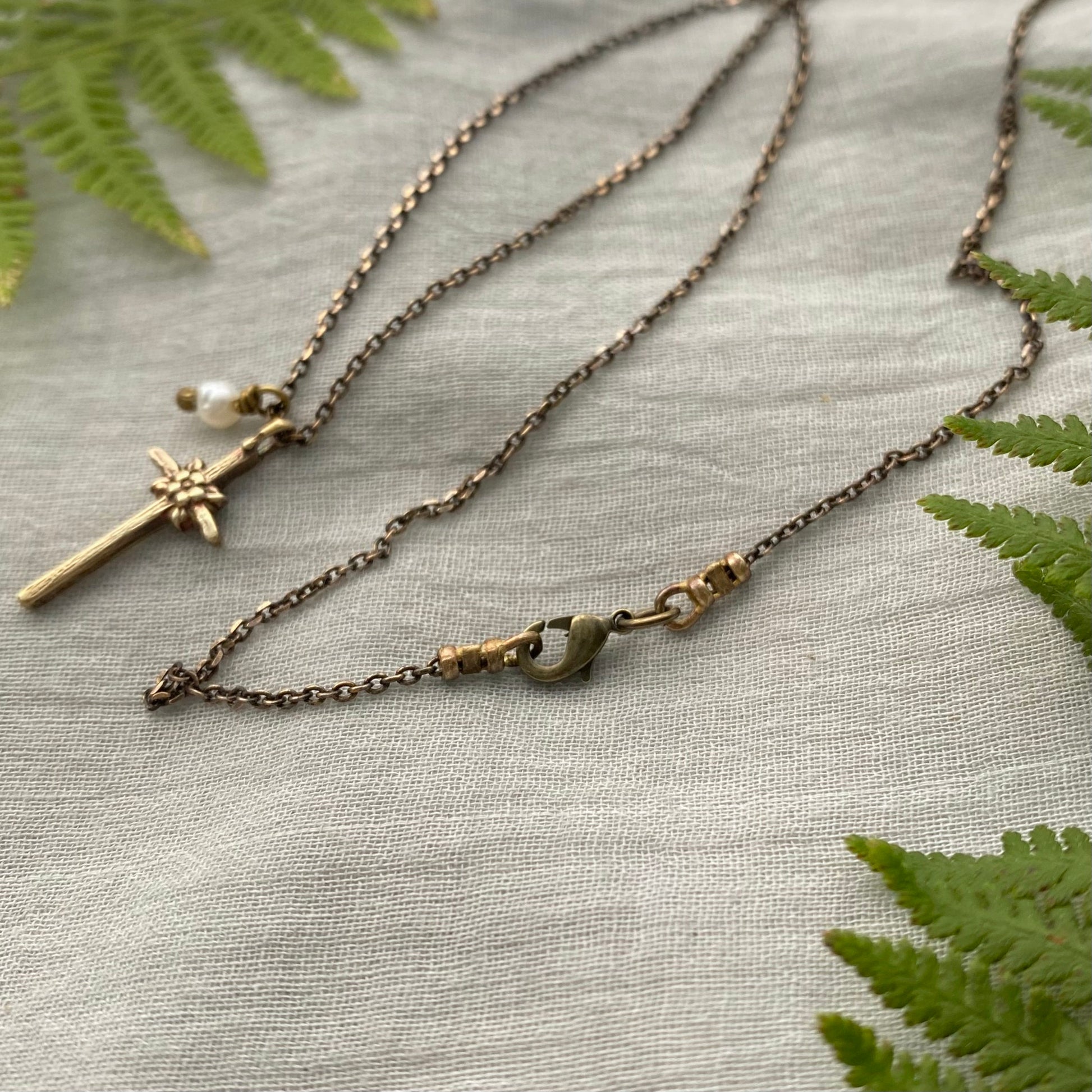 The cross and pearl hang from a fine but strong dark brown, antiqued brass cable chain with a lobster clasp.